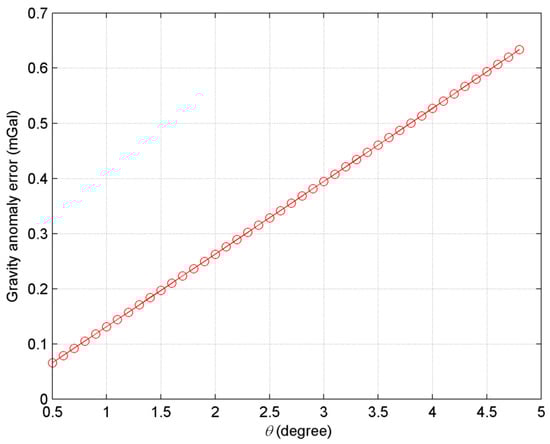 In addition, according to Figure 6 and Figure 7, the farther the sub-satellite points, the worse the accuracy of vertical deflections and gravity anomalies is. This is consistent with Equation (18) since is larger in far range than it is in the near range. In order to prove this point, the gravity anomaly errors with different are shown in Figure 8 when = 0.5 mrad.