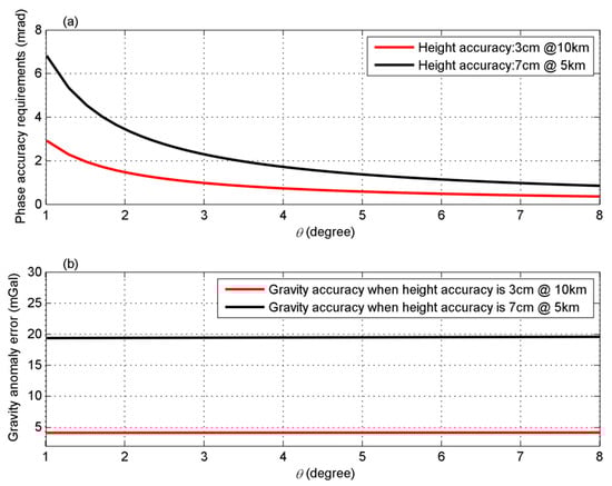 Phase accuracy requirements (a) and gravity anomaly errors (b) with different height accuracy and θ.