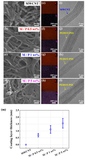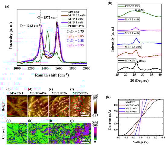 - Li, J.; Liu, J.C.; Gao, C.J. On the mechanism of conductivity enhancement in PEDOT/PSS film doped with multi-walled carbon nanotubes. J. Polym. Res. 2010, 17, 713–718. [Google Scholar] [CrossRef]