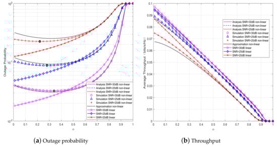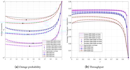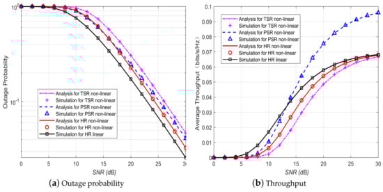 Figure 6 depicts a comparison of the OP and throughput performance for the systems with different relaying schemes, i.e., TS relaying (TSR), PS relaying (PSR), and hybrid relaying (HR) that uses the hybrid energy receiver. It is shown that for the systems with nonlinear EH model under given