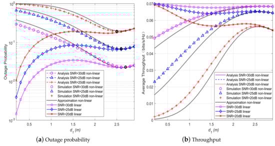 In this section, we present the numerical results for the SWIPT cooperative DF communication systems with hybrid receiver. The derived outage probability and closed-form approximate expressions given in Equations (