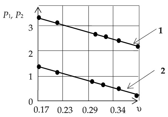 In Figure 3, the dependences of the ratio of the ellipse axes length on the Poisson’s ratio for (1) and (2) are presented graphically.