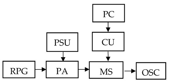 The block diagram of the experimental setup is shown in Figure 6. The RF pulse generator (RPG) excites harmonic oscillations with an amplitude of 4 V at a frequency of 0.5 kHz, which are then fed to a power amplifier (PA) with a power supply unit (PSU). Oscillations amplified up to an amplitude of 200 V are fed to a measuring stand (MS), which is a uniaxial automated centrifuge [20] with the AMS SE prototype placed on it (Figure 6). The MS is controlled by a PC through the control unit (CU) with the specific software. The informative signal take-off is made using the MS built-in connector and the developed signal pickup system from the SE layout (Figure 7). The received MS signal is fed to the oscilloscope (OSC).