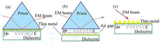 Main techniques to excite surface plasmon polaritons (SPPs): (a) The Kretschmann Configuration; (b) Otto Configuration, and (c) Grating Coupling.
