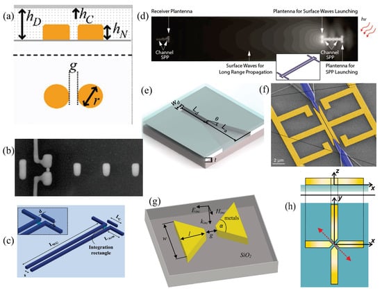 Figure 2f shows a plasmonic nanoantenna design consisting of two metallic arms, forming a plasmonic slot waveguide, filled with a second-order nonlinear organic material []. These systems can be used to accurately measure the amplitude and phase of THz signals if included as a plasmonic phase-shifter in a Mach–Zehnder interferometer (MZI) configuration [], where optical probes are converted into SPRs and back to Si waveguides. Other approaches include the bowtie nanoantenna [,,], i.e., a dipole-type nanoantenna built by two nearby metallic nanotriangles or nanopyramids separated by a small gap [], as illustrated in Figure 2g. This configuration produces a very large near-field enhancement, with its EM field concentrated in the gap region [,,]. A modified version of this dipole consists in the use of plasmonic cross nanoantennas [,], i.e., two dipoles placed perpendicularly to each other, as depicted in Figure 2h. Its shape not only allows for light enhancement and confinement but also to control the wave polarization [], with applications for high-speed optoelectronic devices [] and photodetectors []. Other geometrical approaches including J-pole, mirrored J-pole, and Vee, among others, have been numerically and experimentally studied [,,]. The ability of these plasmonic structures for bending of light at-will stimulated several new trends including metasurfaces, LIDAR antenna arrays, and integration with microwave photonics for the development of faster high-performance optical-wireless communication [,,,,].