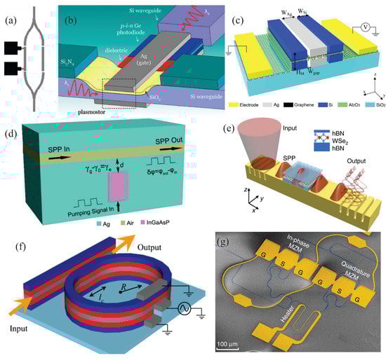 Plasmonic waveguide modulation can also be reached by using a nearby nanoresonator filled with a gain medium (InGaAsP) []. A prototypical structure is illustrated in Figure 3d, consisting of a plasmonic metal-insulator-metal (MIM) waveguide, made by a silver-air-silver channel, with a side-coupled plasmonic rectangular resonator. In this approach, the cavity is electrically pumped to compensate the intrinsic ohmic losses of SPRs [], also known as surface plasmon polaritons (SPPs), propagating in the waveguide. This waveguide-resonator system enables high-contrast modulation, allowing phase shifting up to 180°, with bandwidths up to 100 GHz, and speeds in the order of 0.2 ns. Figure 3e, on the other hand, illustrates a 2D semiconductor-plasmonic heterostructure for an ultra-low switching energy plasmonic modulator []. This latter structure couples an SPP mode, propagating along the plasmonic waveguide, with excitons in the two-dimensional hBN-WSe2-hBN (hexagonal Boron Nitride—Tungsten Diselenide—hexagonal Boron Nitride) semiconductor. The system can work in the linear and nonlinear regimes, through proper modulating of the pump and probe beams, reaching modulation bandwidths around 1.5 THz. Another recent proposal considers a hybrid plasmonic modulator, combining silicon and electro-optic polymers (EOP) with silver, built by a straight waveguide coupled to a ring resonator []. The system is developed, from bottom to top, as silicon-EOP-silver-EOP-silicon on SiO2 substrate, as depicted in Figure 3f. An externally applied voltage in the ring resonator, applied to change the EOP refractive index, is used for modulation of the plasmonic mode along the EOP/silver/EOP interfaces. An in-phase/quadrature (IQ) modulator [], encoding information into the phase and amplitude of light, with attojoule per bit electrical energy consumption has been recently demonstrated []. The system, consisting of two imbalanced high-speed plasmonic MZMs integrated into a SiP Mach–Zehnder interferometer (MZI), is shown in Figure 3g. The phase delay in this platform can be adjusted either by a thermo-optic phase shifter (heater) or by tuning the wavelength, offering complex modulation up to 400 Gbps on a compact footprint.