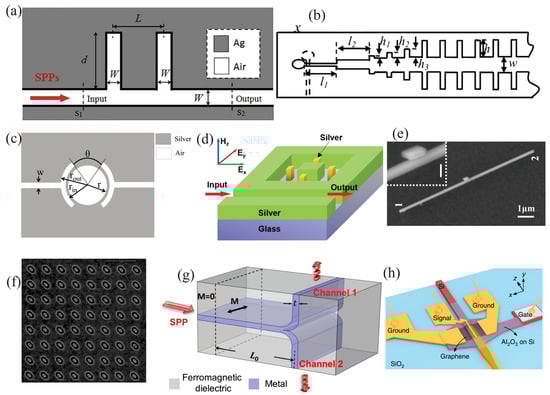 (a) Schematic of a Ag plasmonic waveguide coupled with two identical tooth-like cavities for band-stop filters. (b) Front view of the design of a microwave filter, consisting of two metallic gratings in opposite directions for improved confinement of SSPP waves. (c) Pictorial view of a symmetrical plasmonic ring-resonator-based filter. (d) Three-dimensional view of a nanoblock-loaded rectangular cavity. (e) SEM picture of a nanowire-nanoparticle plasmonic waveguide. (f) SEM micrograph of a two-dimensional chiral plasmonic metasurface. (g) Schematic of a switchable plasmonic router. (h) Illustrative representation of a hybrid silicon-graphene plasmonic waveguide photodetector. (a) and (b) were adapted with permission from Reference []; Copyright 2019 Elsevier. (b) Used with permission from Reference []; Copyright 2014 AIP Publishing. (c) Adapted with permission from Reference []; Copyright 2018 Elsevier. (d) Adapted with permission from Reference []; Copyright 2019 Elsevier. (e) Used with permission from []; Copyright 2019 Elsevier. (f) Adapted with permission from Reference []; Copyright 2019 Elsevier. (g) Used with permission from Reference []; Copyright 2018 Springer Nature. (h) Adapted with permission from Reference []; Copyright 2020 Springer Nature.