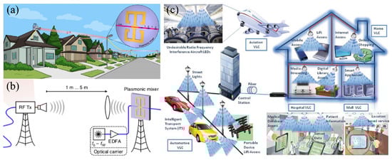 (a) Potential scenario of application for plasmonic-aided telecommunications in a neighborhood. (b) Schematic of an optical-wireless link. (c) Prospective scenarios of visible light communications applications, which can be boosted through the use of plasmonic features. (a) and (b) were adapted with permission from Reference []; Copyright 2018 Springer Nature. (c) Used with permission from Reference []; Copyright 2017 IntechOpen.