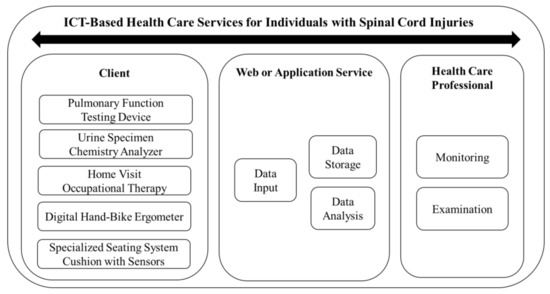 - Jang, W.; Kim, D.; Kim, J.; Yang, S.; Uhm, Y.; Kim, J. ICT-Based Health Care Services for People with Spinal Cord Injury: A Pilot Study. In Proceedings of the 17th International Conference on Smart Homes and Health Telematics (ICOST), New York, NY, USA, 14–16 October 2019; pp. 122–127. [Google Scholar]