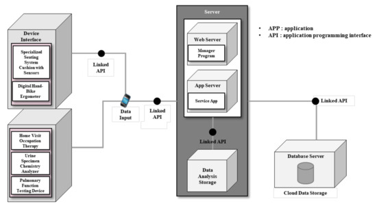 Data acquired following the application of five interventions are entered by the therapist or patient, and subsequently stored on the server in association with the application programming interface (API; Figure 2). There are notably two main servers—the web server and app server—involved as the main players in this study. The “web server” serves as the communication channel between doctors and therapists. Therapists will enter acquired data into the server following the onsite home intervention. They consult clients’ status with doctors, while doctors monitor the entered data. The app server allows the study participants to access their recorded individual health information and schedule. Under circumstances in which maintaining the privacy of sensitive information is required, encryption and the separate storage of data offer further added security.