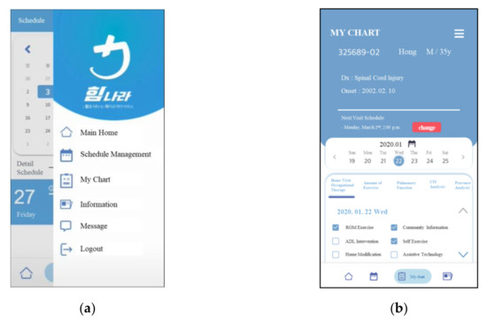 ICT-based applications (Figure 3) were developed with two groups in mind—study participants and visiting therapists—resulting in two versions of the app. The differentiating feature of the participant’s version is that their access is limited to only their own file. Participants logged into the app can typically monitor their health information and also schedule their next visit with the therapist. Participants can also send and receive messages via the app directly to therapists or doctors. The second version is customized for the home visiting therapists. The application allows them access to all of the entered information of the participants to whom they have been assigned. Direct communication with participants and physicians using the app is also feasible. Data input is allowed while home visits are in progress or up until the end of the following day. Physicians can communicate any resultant data with therapists, while therapists can communicate with physicians for any consultative advice while the home visit service is in progress.