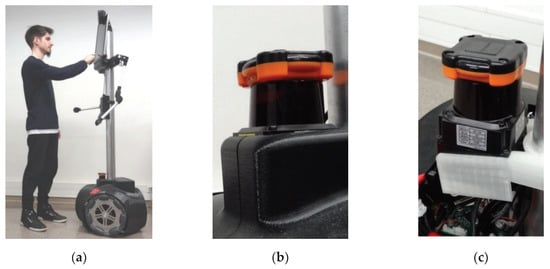 (a) APR-03 mobile robot operated by an author of this paper. (b) Close-up image of the onboard LIDAR sensor. (c) Detail of the onboard LIDAR without the protective housing cover.