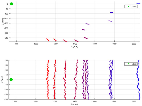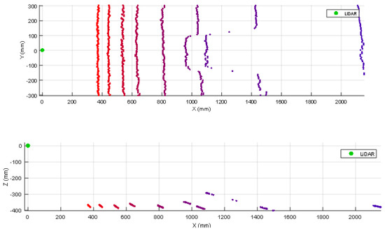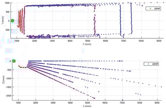 Top (up) and lateral (down) view of different scans obtained when placing a small box on the ground at approximately 1000 mm from the LIDAR. The height of the LIDAR was 380 mm and the tilt was changed from 45° (reddish ground line, close to X = 0) to 80° (violet ground line) in increments of 5°.
