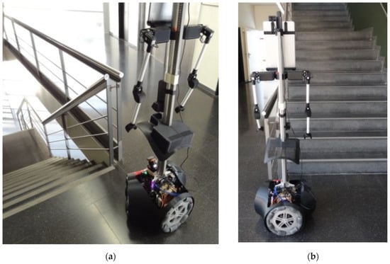 Mobile robot APR-03 placed in front of: (a) a stair going down and (b) a stair going up.