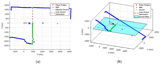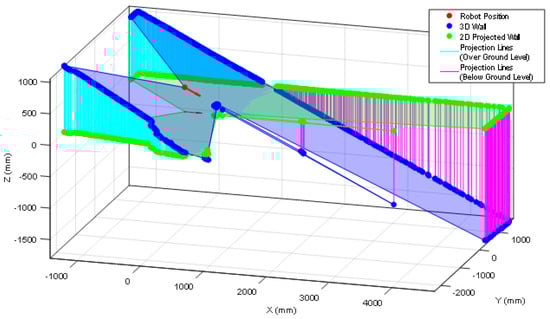 The push-broom configuration requires pre-processing the 2D scan data gathered by the LIDAR before applying the ICP algorithm for self-location which consist on converting the 2D scan data in a 3D point cloud, removing the ground and ceiling points from the 3D point cloud (because the reference map does not include such information), and the projection of the 3D point cloud in the horizontal 2D plane used by the reference map in order to apply ICP. The complete pre-processing procedure has the following steps: (1) get one complete 2D scan data from the LIDAR, (2) delete the distance points lower than 20 mm as they are measurement artifacts, (3) use the height of the measurement plane of the LIDAR and the tilt angle to convert the 2D scan data in a 3D point cloud (see Figure 11), (4) delete the ground points in the 3D point cloud (points with a height between 50 and −50 mm), (5) delete the ceiling points in the 3D point cloud (points with a height higher than 2430 mm), (6) project the remaining 3D point cloud in the 2D horizontal plane of the reference map (see Figure 11), and (7) apply the ICP algorithm for self-location with this projected scan.
