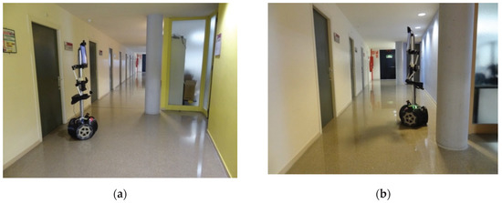 Mobile robot APR-03 in the corridor: (a) at the right side and (b) at the left side.