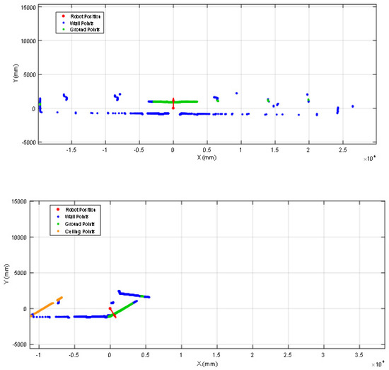 2D projection of some scans gathered by the LIDAR placed at the starting positions shown in Figure 12: (top) right side of the corridor and (down) left side of the corridor.