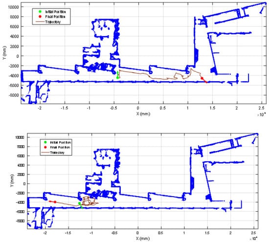 Estimated trajectory of the mobile robot with the 2D LIDAR tilted down 25° for the cases shown in Figure 12: (top) right side of the corridor and (down) left side of the corridor.
