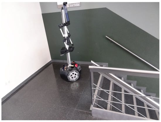 Finally, Figure 15, Figure 16 and Figure 17 describe one of the experiments in which the mobile robot APR-03 performed a pseudo-random displacement in an area of the facility with stairs and a large lateral transparent wall. All of these obstacles were located in a relatively small area. Such conditions are a real challenge for any mobile robot because there is a real risk of falling down the stairs and to collide with the stairs going up or the transparent wall. On the one hand, the mobile robot APR-03 has avoided any collision or falling thanks to the information gathered with the tilted 2D LIDAR. On the other hand, the information gathered with the tilted 2D LIDAR has been processed and used to self-locate the mobile robot using the ICP algorithm and the information provided by a 2D horizontal map. This map was created previously in another exploration experiment with a mobile robot mounting a 2D horizontal LIDAR.