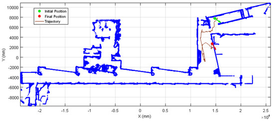 The ICP [28] is an algorithm mostly used in mobile robots to virtually reconstruct 2D and 3D scenarios [29] and track its position and orientation in the scenario. The mobile robot APR-03 [25] performs SLAM using the ICP algorithm to process the 2D scanning point clouds gathered from an onboard UTM-30LX 2D LIDAR placed horizontally in front of the mobile robot (Figure 1) at a relative height of 380 mm. The result of the SLAM procedure was the creation of a horizontal 2D map (a horizontal slice of the facility) (Figure 2) and the tracking of the displacement of the mobile robot in this 2D map.