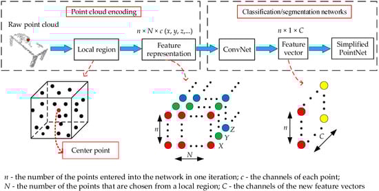 PointNet is a pioneer in directly processing point clouds. To verify the effectiveness of the proposed point cloud encoding strategy, only a simple deep learning network is designed on the basis of PointNet. The network is used to process the feature representation of each point. The overall framework of the proposed method is shown in Figure 1, which consists of a point cloud encoding block and a classification/segmentation networks block. Details of the proposed method are provided separately in the following sub-sections.