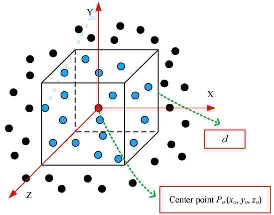 It is assumed that a point cloud is represented as a set G = {Pi| i =1, 2, …, n}, Pi is represented using (xi, yi, zi) coordinates and other extra channels such as color and normalized location. The process of searching for a local region is shown in Figure 2. The local region of a point Po (xo, yo, zo) is searched using a cube with side length d. The point Po is located at the center of the cube and is called the center point. The range of the local region for Po is determined based on (1). The cube is aligned with the coordinate axis. The axis-aligned cube helps determine whether a point is in the local region. If the three coordinate values of a point satisfy (1) at the same time, then the point is considered to belong to the local region.
