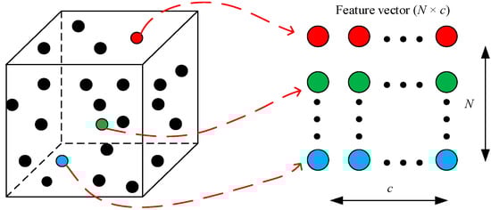 Because the density of the points may be different across different locations, the point cloud may contain many points in some areas, while it only contains a small number of points in other areas. The number of points included in a local region may be less than N if the side length of the cube is too small. In response to this situation, the zero vector with c-dimension is added to ensure that the dimension of the feature representation is N × c.