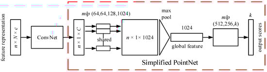The full network architecture for a 3D object classification task is visualized in Figure 4. The input to the network is these feature representations, with dimensions of n × N × c, where n is the number of the points entered into the network in one iteration; N is the number of the points that are chosen from a local region to construct the feature representation; and c indicates the number of the channels of each point. These feature representations are first processed by a simple one-dimensional convolutional neural network block (ConvNet). A new feature vector with dimensions of n × 1 × C is then obtained. C is the channels of the new feature vectors that are input to the simplified PointNet. The shared multilayer perceptron with four layers is then applied to the new feature vector. The max pooling is used to extract the global information. The final classification scores for k classes are returned at the end of the network with a fully connected layer.