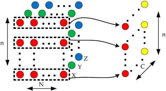 Each point in the set S has an effect on the center point Po. To reduce the data size, only N points are randomly selected from these points to encode the center point. The center point is encoded into a two-dimensional feature vector. The process of encoding the center point is shown in Figure 3. c is the number of the channels used to represent the original point cloud. Each row represents an original point from the local region, and is an element of the feature vector. It is pointed out that the relative positions of the original points in the feature vector are randomly arranged.