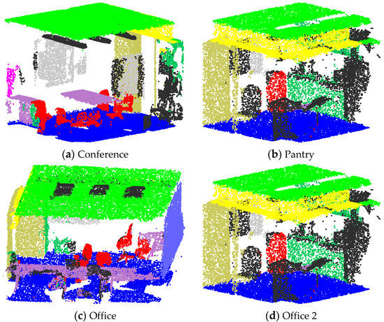 During the training, the maximum epoch is set to 40. To prevent overfitting, the training model is evaluated for every epoch, and only the best model is saved. Other parameter settings are identical to those in PointNet. The experimental results are shown in Table 5. The semantic segmentation results of some rooms are visualized in Figure 7. Some walls are removed in order to clearly show the indoor objects.