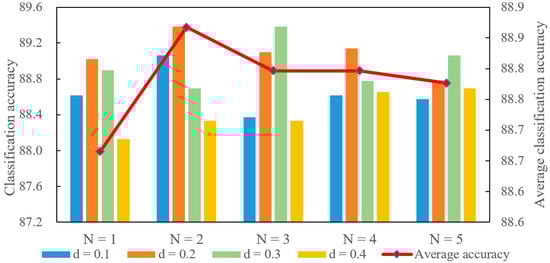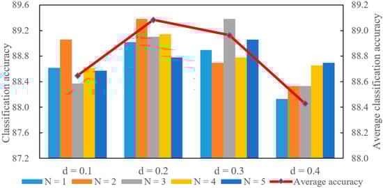 Each value of the parameter d corresponds to multiple values of parameter N. Similarly, each N also corresponds to different d values. Therefore, each parameter corresponds to multiple experimental results. The average for all of these results are used to display the effects of the corresponding parameter. These experimental results are shown in Figure 8and Figure 9. The scale on the left indicates the classification accuracy corresponding to each pair of parameter combinations. The scale on the right indicates the average classification accuracy that is represented using a polyline. The average classification accuracy is selected as the primary analysis result for convenience.