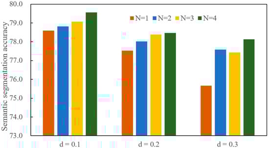 As shown in Figure 10, semantic segmentation accuracy increases as the N varies from 1 to 4 for each fixed d value. More points are used to encode the center point when N is larger. The feature representation of the center point contains rich local information. The local information is beneficial for the deep learning network to learn the distinguishing semantic information. Therefore, the semantic segmentation accuracy is high when N is set a large value.