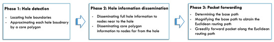 To bypass a hole, traditional schemes appropriately switch between greedy and perimeter forwarding modes, in the latter of which the data packets are forwarded along the hole boundary. These proposals require a specific embedding of a planar graph (e.g., Gabriel Graph), a complicated procedure based on a restrictive assumption about the underlying graph (e.g., a unit-disk graph) [23,26,27,28,39]. Although these traditional approaches can alleviate the local minimum phenomenon, they face two critical problems. The first problem is the enlargement of routing paths and the second problem is the traffic concentration around the hole boundary [40,41].