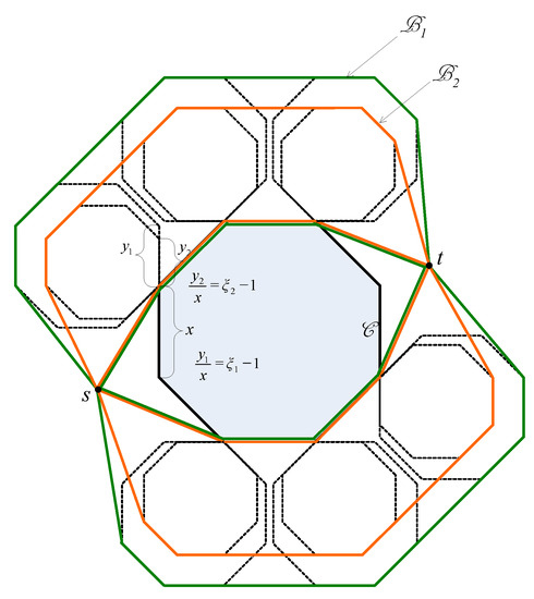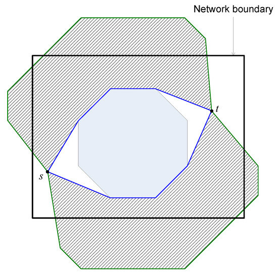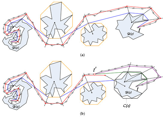 Otherwise, if s is a t-blind node (Figure 2b) (i.e., s does not have full information of the hole containing t), , thus it cannot determine a Euclidean path to t which bypasses all the holes. Therefore, s determines the base path as an Euclidean path from s to a vertex of which bypasses and . This base path then is magnified through a transformation to obtain the Euclidean routing path. The packet then is forwarded along the Euclidean routing path until reaching a node (let us call this node as ) that has the hole information of . Please note that since the last vertex of the Euclidean routing path is a vertex of , such a node always exists. With the hole information of , determines a so-called sub-base path which is the shortest Euclidean path from to t, which bypasses , and . This sub-base path then is magnified by a transformation to obtain a so-called sub-Euclidean routing path. The packet then is greedily forwarded along the sub-Euclidean routing path until reaching t.