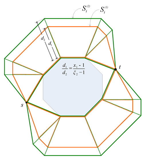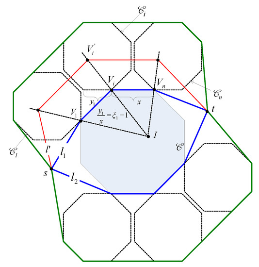 First, l is decomposed into segments, each of which is a boundary segment of a polygon of . Then, for every segment that is a boundary segment of a concave polygon, it is further divided into sub-segments, each of which consists of consecutive edges of polygon staying on the same side with respect to the hole. Let us denote the segments/sub-segments composing l as . Then, each () is scaled up using a specific homothetic transformation denoted as , whose scale center (denoted as ), and scale factor (denoted as ) are defined as follows. Suppose consists of vertices ( is a positive integer), and let us denote ’s vertices as . If is a boundary segment of a convex polygon, then is a random point staying inside the polygon whose boundary containing . Otherwise, is a random point staying on the opposite side with the hole concerning the .