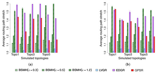 Regarding Topology 6 in 1-n communication, it can be seen that BSMH with shows the worst performance and BSMH with shows the third-worst performance among all the protocols. This phenomenon can be explained as follows. First, as this topology consists of many small holes, the diversity of routing paths determined by the other protocols (i.e., LVGR, EDGR, GPSR) is increased. Therefore, the performance attained by the other protocols in this topology is better than those attained by the same protocols in other topologies. Secondly, as the spaces between the holes in this topology are small, the scale factors used in the homothetic transformations for determining the Euclidean routing paths in BSMH is limited. In other words, the diversity of routing paths determined by BSMH is degraded in Topology 6. Consequently, BSMH with small values of cannot improve load balance in comparison with other protocols.