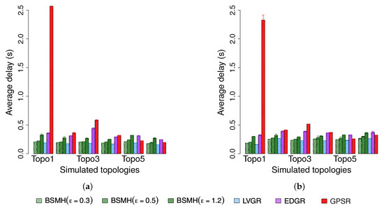 Figure 14 depicts the average end-to-end delay of all successfully delivered packets. Since LVGR attains the best performance in terms of the average routing path stretch, it also results in the smallest average end-to-end delay. Following LVGR, BSMH with small values of (i.e., and ) gains the second-best performance. Moreover, the performance gap between LVGR and BSMH is insignificant when is small. For examples, when , the average end-to-end delay resulted by BSMH is smaller than times that caused by LVGR in both 1-n and n-n communication. Similar to the routing path stretch, the end-to-end delay caused by BSMH increases with the increase of . When reaches , BSMH may cause an end-to-end delay higher than time that of LVGR in the worst cases (i.e., Topo 3, 4 in 1-n communication). In comparison with EDGR, it can be seen that the end-to-end delay caused by BSMH with and are smaller than that of EDGR in all topologies. Specifically, BSMH with results in an average routing path stretch smaller than and regrading 1-n and n-n communications, respectively. When increases to , the ratio between the routing path stretch of BSMH to that of EDGR is smaller than and with respect to 1-n and n-n communications, respectively. The performance of GPSR strongly depends on the network topology. Specifically, its end-to-end delay is extremely higher than those of the other protocols in some cases such as Topologies 1 and 3 despite the fact that its average routing path stretch is not much higher than that of the other protocols. We observe that the end-to-end delay is affected not only by the transmission time between the hops, but also is contributed by the processing time in the hops. While the former one closely related to the routing path routing path stretch, the latter one has a strong relationship with the load balance. Hence, there are two main reasons causing the worse performance of GPSR in terms of end-to-end delay. The first reason is due to the long route path (as described in Section 5.4.1), and the second reason is due to the traffic concentration around the hole boundaries (which has been shown in Section 5.4.6).