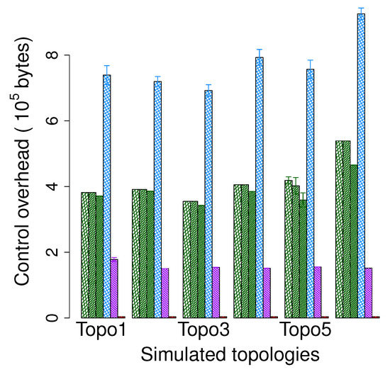The total amount of control packets required by the protocols is presented in Figure 15. As the control overhead does not depend on the communication type, we plot the results regarding 1-n communication.