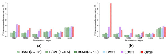 The average energy consumed to delivery one packet is shown in Figure 16. In general, BSMH and LVGR outperform EDGR and GPSR. Moreover, the performance of BSMH and LVGR are almost similar. GPSR shows the worst performance and its energy consumption per packet is much higher than those caused by other protocols in most the cases. EDGR results in a poor performance regarding Topologies 1, 2, 3, 4. This is due to its high delivery ratios and large routing path stretch (see Section 5.4.1 and Section 5.4.5). In the other topologies, EDGR attains a similar performance with BSMH and LVGR. This phenomenon can be explained as followed: As BSMH and LVGR use shorter routing paths (reflected by better performance in terms of routing path stretch as shown in Section 5.4.1), they may consume less energy than EDGR regarding data transmission. However, as will be shown in Section 5.4.3, the control overhead caused by EDGR is much smaller than those of BSMH and LVGR, thus the energy consumed by transmitting the control packets of EDGR is smaller than those of BSMH and LVGR.