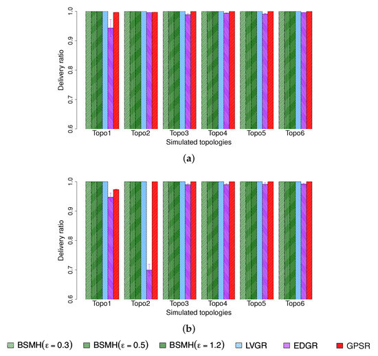 Figure 17 depicts the delivery ratio of the protocols. As shown, BSMH and LVGR achieve the best performance with the delivery ratio approximately equals to 1 in both 1-n and n-n communication types. The reason is because BSMH and LVGR forward all packets along hole-bypassing paths. As hole-bypassing paths do not intersect the holes’ interior, the local minimum problem is solved thoroughly, and all packets are delivered to the destinations. GPSR achieves a good performance in topologies where the sources stay outside of concave areas of the holes, e.g., Topologies 4, 5, 6. When the sources stay inside of concave areas of the holes, e.g., Topologies 1, 2, GPSR suffer from local minimum problem and some packets are dropped. In all the cases, the delivery ratio of GPSR is higher than .