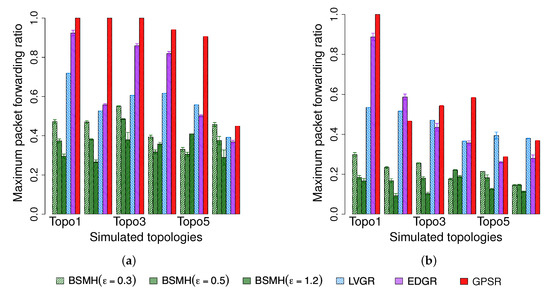 The maximum packet ratios caused by the protocols are shown in Figure 18. As shown, our protocol (especially with high values of ) strongly outperforms the other ones. Specifically, the maximum packet forwarding ratio caused by BSMH for all settings of is smaller than those caused by LVGR, EDGR and GPSR in all topologies excepting topology 6 in 1-n communication. EDGR and LVGR attain the second-best and third-best performances in most of the cases, and GPSR shows the highest maximum packet forwarding due to the perimeter routing nature. With , BSMH results in the maximum packet forwarding ratio which is less than that of LVGR, and EDGR and that of GPSR, in all 1-n communication topologies. In the best cases, the maximum packet forwarding ratio caused by BSMH is smaller , and those of LVGR, EDGR and GPSR, respectively. Regarding the n-n communication, BSMH with reduces the maximum packet forwarding ratio by the factors of , and compared to LVGR, EDGR, and GPSR, respectively. In the best cases, the maximum packet forwarding ratio resulted by BSMH is smaller than , and times those of LVGR, EDGR, and GPSR, respectively. The maximum packet forwarding ratio caused by BSMH with is always smaller than that of LVGR, that of EDGR (in 5/6 cases), and that of GPSR in the 1-n communication. With respect to the n-n communication, the maximum packet forwarding ratio caused by BSMH with is always smaller than that of LVGR, that of EDGR and that of GPSR. When reducing to , BSMH outperforms all the existing protocols regarding all topologies in the n-n communication and 5/6 cases regarding the 1-n communication.