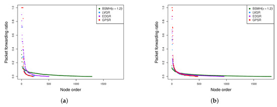 Another observation is that the maximum packet forwarding ratios of all protocols in n-n communication are smaller than those in 1-n communication. This can be seen by comparing Figure 18a,b, where the values plotted in Figure 18b are much smaller than those plotted in Figure 18a. Moreover, the performance gaps between BSMH and the other protocols regarding n-n communication is larger than those regarding 1-n communication. This phenomenon can be explained by the so-called hotspot problem caused by the high traffic load around the destination.