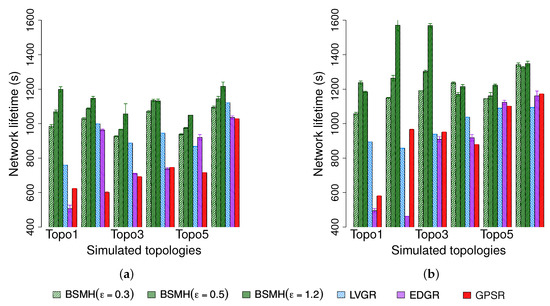 Generally, the decrease of results in the decrease of the network lifetime of BSMH. When reducing to , the network lifetime attained by BSMH is still higher than LVGR, EDGR and GPSR in all topologies excepting Topology 6 in 1-n communication. Specifically, in the best cases, the ratios of the network lifetime of BSMH with to those of LVGR, EDGR and GPSR are , and in the 1-n communication, and , and in the n-n communication, respectively.