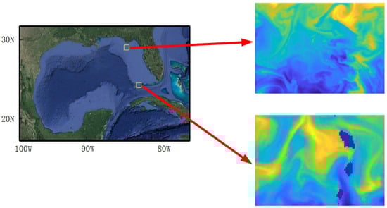 Let be the utility map generated by the needs of marine scientists and assumed to be known a priori. UMVs equipped with a CTD sensor or chlorophyll fluorometer can be used to measure the scientific interest areas. The utility map, a two-dimensional (2D) matrix with probability value in , is a combination of features of scientific interest, such as salinity, chlorophyll fluorescence, dissolved oxygen, turbidity, etc. [] The areas with a higher probability value of interest in the utility map are where scientists desire the UMVs to detect and collect relevant informative data. Ocean currents data are obtained from the National Oceanic and Atmospheric Administration (NOAA). The utility map is generated based on sea temperature data from NOAA in this research. For more details, see: https://www.ncdc.noaa.gov/.