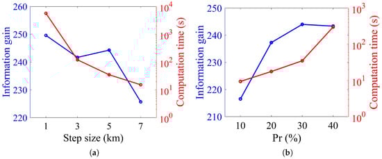 The maximum ratio value determines the termination condition. It can be noted from Figure 2b that the larger the ratio value is, the higher the computation time is and the more the information gathering is. Since and have almost the same information gathering and is with less computation time, is the proper value for the maximum ratio value in this research.