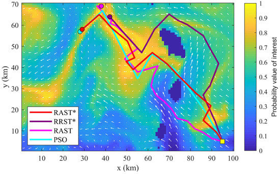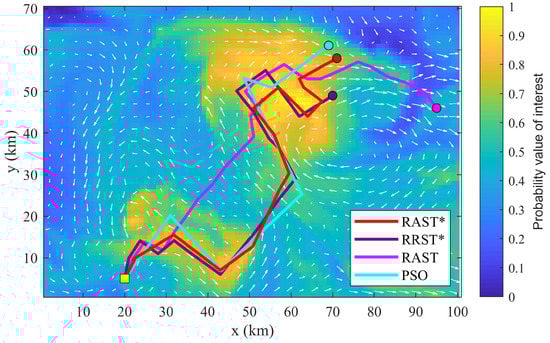 This scenario discusses the performance of RAST*, RRST*, RAST, and PSO over a scientific interest area without obstacles in the Gulf of Mexico on 24 December 2017. The utility map is the normalized sea temperature data of grids and each grid represents an area of 1 km × 1 km.