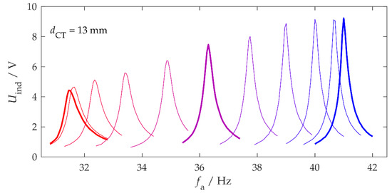 The adaptivity behavior was tested on the test bench for different rotation angles and magnet distances , with an acceleration amplitude of . was the smallest distance at which the motor could keep the magnet at rest. Figure 3 shows the resonance curves of the induction voltage for different angles, which are color-coded; red corresponds to repulsive magnetic forces () and blue to attractive forces (). was changed in constant steps of 18° by the MCU.