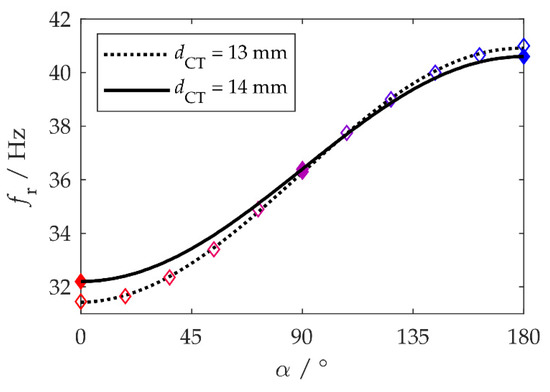 Relationship between the magnet angle α and the resonance frequency fr. The unfilled and filled diamonds, respectively, represent the measured resonance frequencies fr for dCT = 13 mm (see Figure 3) and dCT = 14 mm. The solid and dotted lines are the results of fitting the trigonometric function (4) to the measurement data.