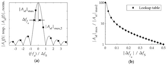 Evaluation of the vibration frequency fa from a discrete spectrum involving the leakage effect: (a) The amplitude spectrum |As(f)| (solid line) and discrete spectrum |Asf(f)| (crosses) of a harmonic signal with the frequency fa measured over a time T, which is not an integer multiple of 1/fa. (b) The ratio of the two largest values in the discrete spectrum according to Equation (6). A discrete version of the function involving 21 data points was saved in a lookup table. The pole at was arbitrarily replaced by a finite value of 100.
