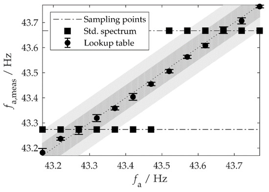 To test the algorithm, the acceleration sensor was excited on the test bench with a harmonic vibration (amplitude , ). During the time the sensor measured 1024 values. Figure 6 shows the frequencies , which the MCU determined from the measured values, both for evaluation without post-processing () and for the new method using the LUT. Each frequency was measured five times. Without post-processing, the measured oscillation frequency was restricted to the discrete sampling frequencies, i.e., to integer multiples of . The deviation from the true vibration frequency can be up to and therefore violated the requirement. In contrast, the measured frequencies evaluated by the LUT method deviated by less than 0.05 Hz from the true values (including the measurement uncertainty), which met the requirement. Without post-processing, a measurement time of at least would be necessary to achieve this accuracy. The MCU only needed 44 ms to receive and process the measurement data. The data are transmitted in blocks every 100 ms, with the MCU being in standby mode in between.